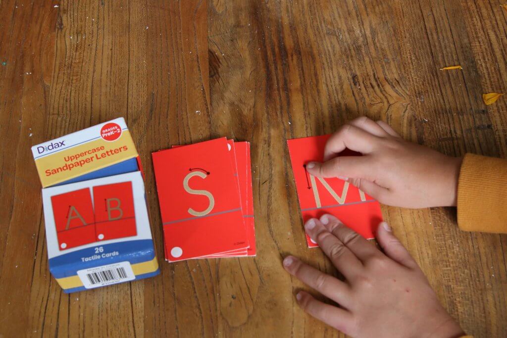 Sandpaper letters provide a multi-sensory approach to learning letters. We will practice the sound of the letter while my daughter traces the letter with her finger. I love too that the letters have a dot for where you are supposed to start when writing the letter.