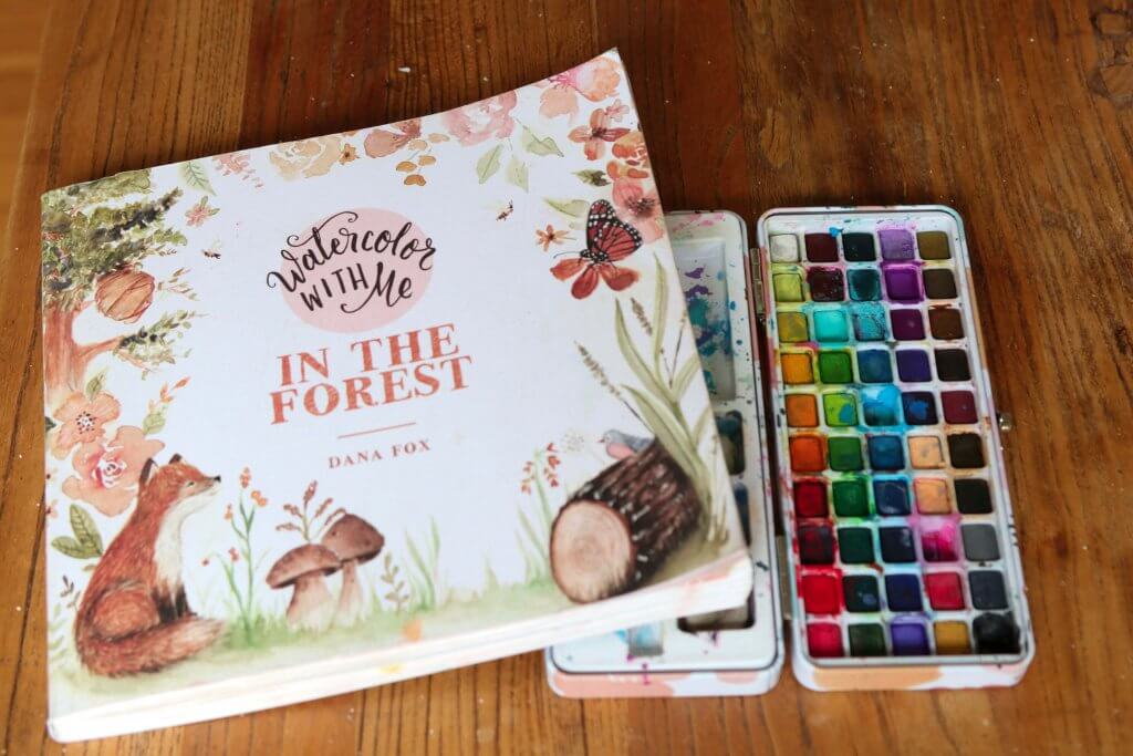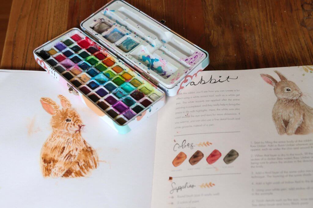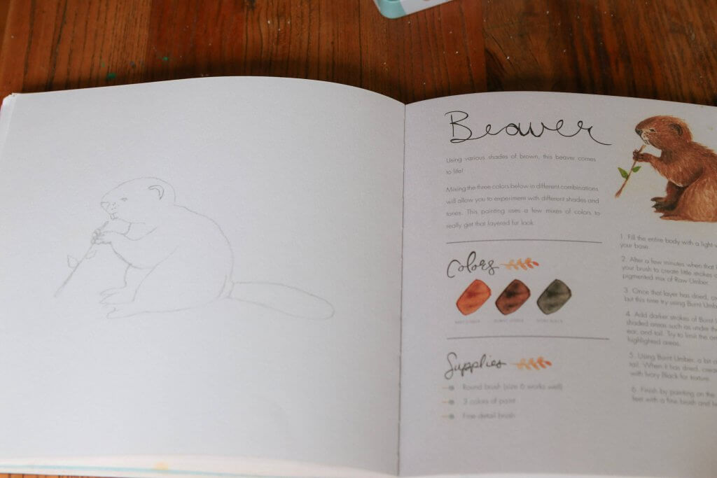 The Watercolor with Me book is so sweet because the paper of the book is watercolor paper, the animal or flower is drawn in what looks like light pencil, and then there are instructions on the side for what colors to use and the technique that will help you achieve a similar picture to the one given.