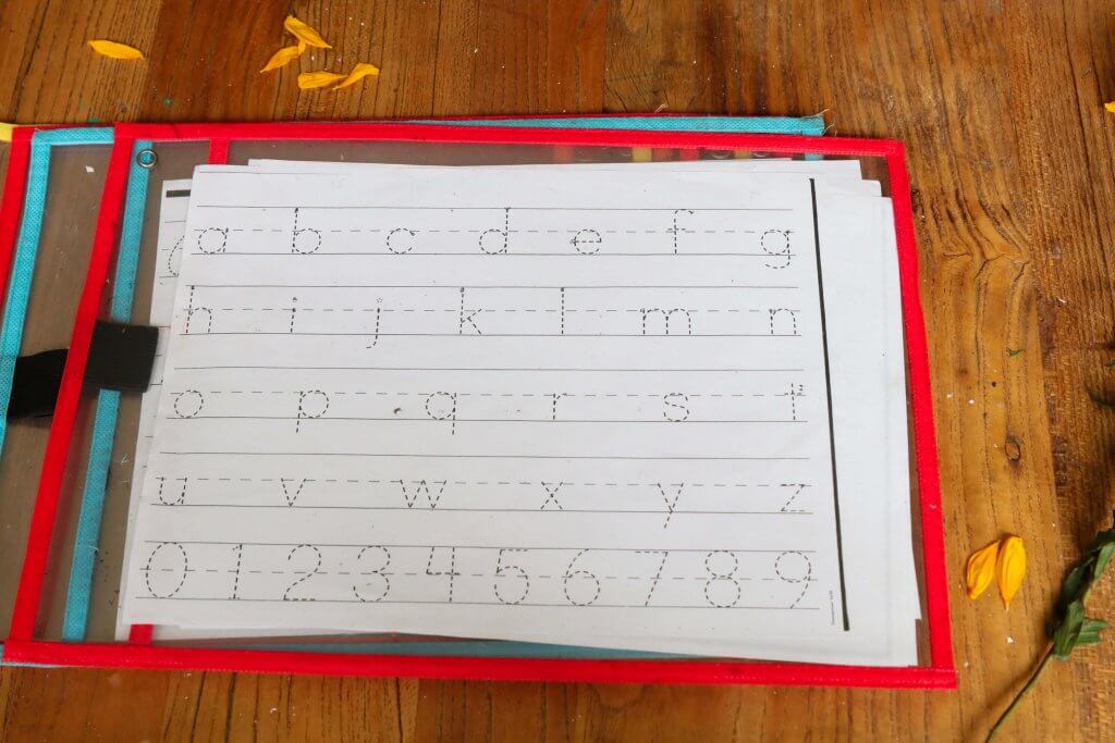 If you don’t feel like laminating every little thing, these handy menus are a game changer. Just slide the tracing sheet or activity into the menu. Then they can use a dry erase marker to write. So handy!